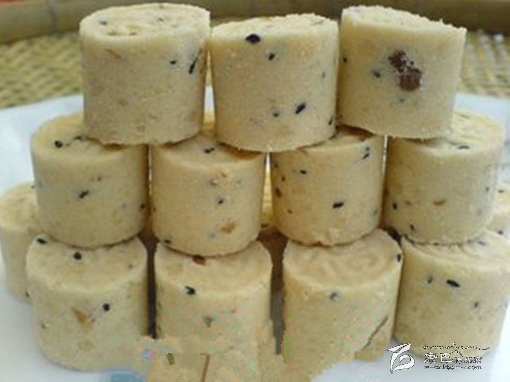八寶年糕 原料 糯米1000克,白糖、麻仁青梅、葡萄干、瓜條、白蓮、桃脯、豬油各20克。 做法 先將糯米淘洗干凈,水浸24小時后上蒸籠蒸爛,取出用木棒搗爛攤涼,把白糖等搓勻成餡,在方盤內(nèi)刷豬油,鋪上搗爛的1厘米厚的糯米飯,每鋪一層放入適量的餡,共鋪3層,蒸熟后用刀切為小塊即成。 夾心年糕 原料 糯米1000克,青紅絲、小豆、白糖各50克。 做法 將糯米洗凈浸泡24小時后上蒸籠蒸爛,取出用木棒搗爛后展切成2塊,把小豆煮爛加糖再加青紅絲做成餡撒于其中一塊上,再將另一塊放在餡上壓實壓緊,用刀切成塊即可。