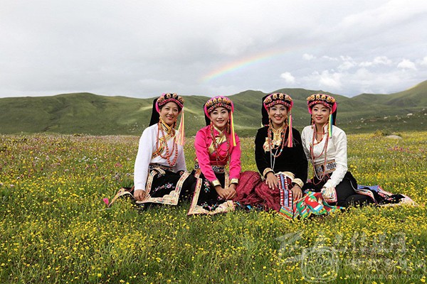 藏族姑娘同漢族姑娘一樣辮一根獨(dú)辮子,辮子的根部用紅頭繩扎成約四寸長(zhǎng)的發(fā)枕,藏名叫“呷糾”。唯獨(dú)不同的是藏族姑娘獨(dú)辮子成三角形盤(pán)于頭頂,更顯得美觀、大方、素雅。